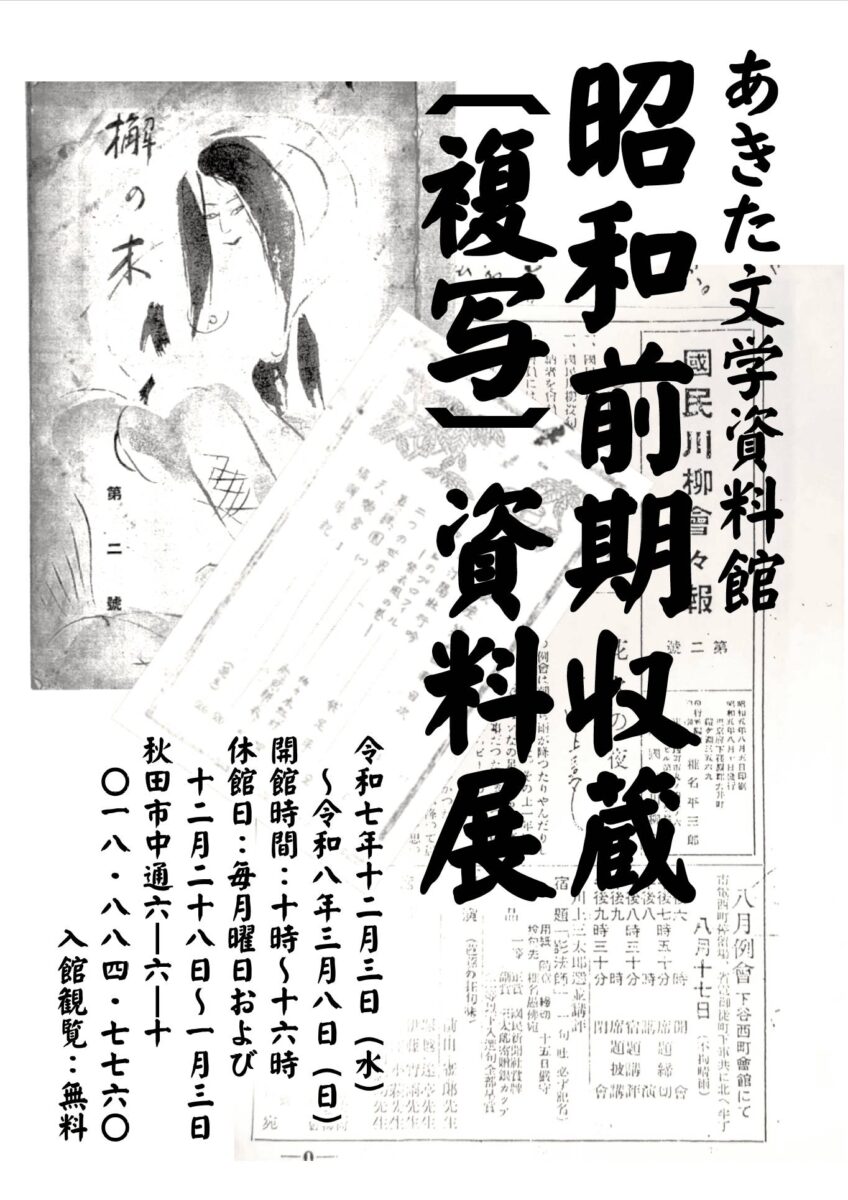 本展では、当館で収蔵している資料のうち、昭和前期に秋田県内で発行された文学資料を中心にご紹介いたします。